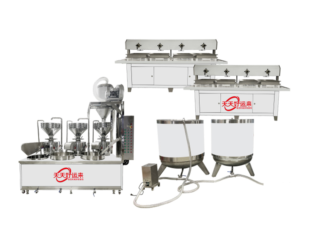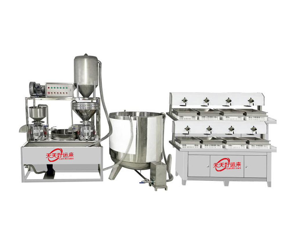我公司生產(chǎn)豆腐機(jī)在國(guó)內(nèi)是較早的企業(yè),多年來(lái)通過(guò)對(duì)設(shè)備的不斷改進(jìn),利用現(xiàn)代科技與傳統(tǒng)工藝的完美結(jié)合。使設(shè)備外觀設(shè)計(jì)美觀、智能化高,操作簡(jiǎn)單,主要有自動(dòng)上豆系統(tǒng)、磨漿機(jī)系統(tǒng)、拌渣提升系統(tǒng)、煮漿桶(蒸氣機(jī)用戶自備)、成型機(jī)等組成。機(jī)器采用不銹鋼制造,干凈衛(wèi)生,技術(shù)領(lǐng)先,質(zhì)量可靠,經(jīng)久耐用。實(shí)現(xiàn)了批量生產(chǎn)過(guò)程自動(dòng)化,具有高效、省時(shí)、耗能低等優(yōu)點(diǎn)。采用先進(jìn)空真上豆技術(shù)和連續(xù)磨漿技術(shù),瞬間加熱工藝,保證了蛋白質(zhì)不受破壞,從而使生產(chǎn)出來(lái)的豆制品營(yíng)養(yǎng)更豐富,味道更鮮美。工藝流程: 將浸泡好的黃豆由高速分離磨漿機(jī)加工,排出豆渣,產(chǎn)出的豆?jié){經(jīng)過(guò)蒸汽加熱達(dá)到去腥,并煮漿均質(zhì),并添加輔助原料消泡、凝固劑(如鹵水、石膏、內(nèi)脂、酸漿等)、成型和深加工處理便可產(chǎn)生出營(yíng)養(yǎng)豐富的豆制品如:豆?jié){、豆腐腦、豆腐、豆干、豆皮、素雞、豆泡等制品,適用于大型賓館、超市、企業(yè)食堂、工程店及食品廠批量加工使用。