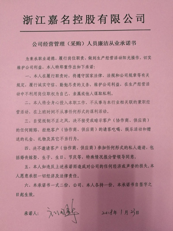 1月23日,公司召開經(jīng)營管理(采購)人員廉潔從業(yè)承諾書簽訂會(huì)議,11名公司廉潔風(fēng)險(xiǎn)重點(diǎn)崗位的經(jīng)營管理(采購)人員參加會(huì)議,并簽訂了廉潔從業(yè)承諾書。公司莫總和黨建指導(dǎo)員吳紀(jì)聯(lián)分別講話。