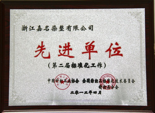 2012年4月,浙江嘉名染整有限公司被中國針織工業(yè)協(xié)會、全國紡織品標準化技術(shù)委員會針織品分會評為第二屆標準化工作先進單位。