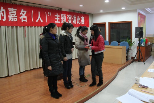 12月17日晚,公司工會、團支部聯合舉辦的 “我心中的嘉名(人)”主題演講比賽,12名選手參加了比賽。李丹華獲一等獎,范曉磊、張金金獲二等獎,宋建會、陳華芳、楊 麗獲三等獎,陸松芬、謝建甫、衛建秋、鐘曉蘭、黃孝軍、陳慧琴獲鼓勵獎。鳳鳴街道黨委委員吳霞萍,公司總經理莫炳榮為獲獎選手頒獎。